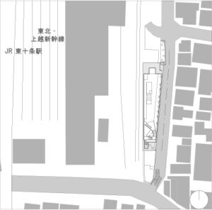 この「キッズタウン東十条保育園」は、JR東十条駅の操車場の一角、南北に細長い狭い敷地いでした。