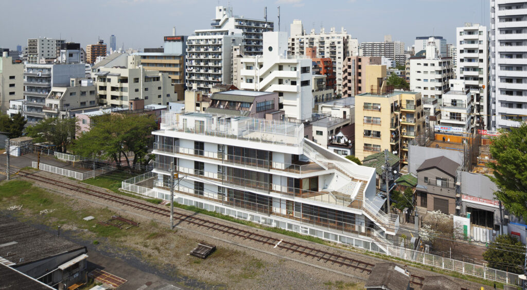 設計のテーマは「すべての場所が遊び場であること」です。線路が見える西側の長い廊下、階段と滑り台、ボルダリングもできるルーフテラス、高低差を活かし、さまざまな遊びを発見できる建築を設計しました。積層するテラスや縁側からは、操車場越しに新幹線の走る様子が見える、エキサイティングな環境でもあります。こどもたちはこの長い縁側が大好き。何度も行ったり来たり、走っています。