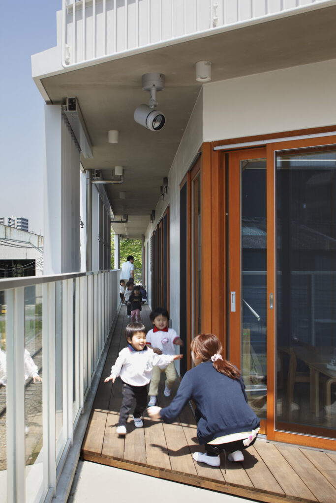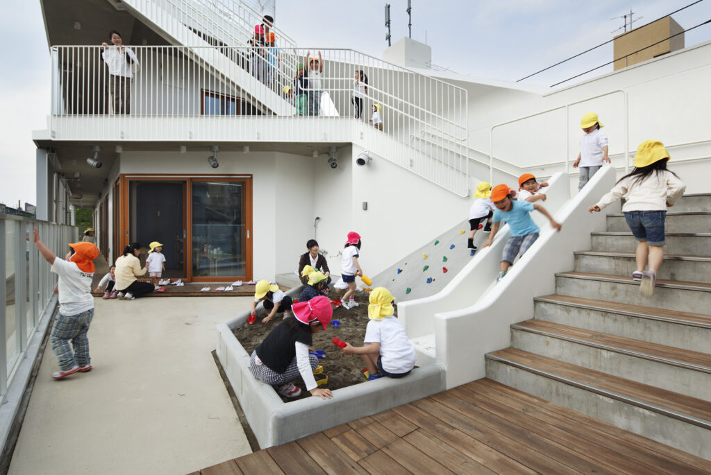 保育園の建築を考えるとき真っ先に考えること。それは、子どもたちの自由な外遊びを誘発することです。自分が建築家として、小さな子どもたちが元気に育つための環境は、なんといっても屋外とのつながりだと考えています。