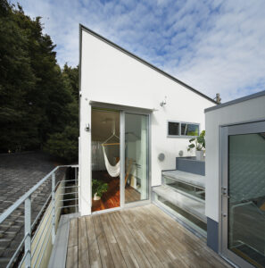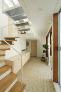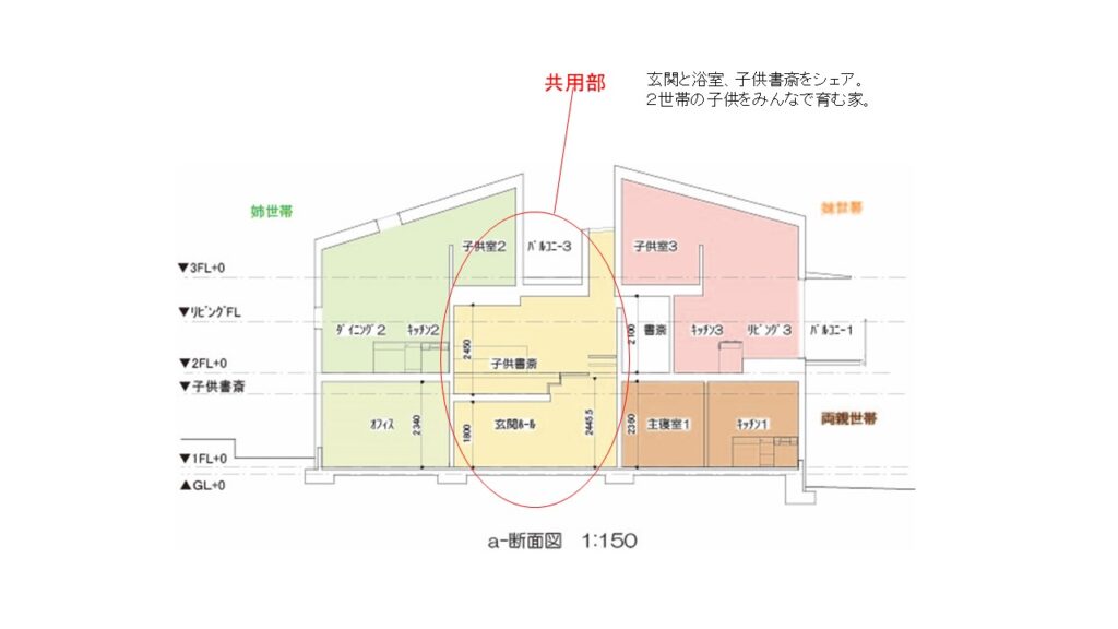 3世帯の住まいを確保するには地下もつくって工事費は1億円以上、というハウスメーカーの提案があり困っておられるときに、私たちがお会いしました。私たちは、半分の予算で3世帯の住まいをつくることを設計しました。工夫したのは姉妹の二家族の世帯とご両親世帯を南北に分割して配置し、中央に共用の玄関ホールと階段、屋上テラスや、子ども書斎、シャワーを配置しました。各住戸の専有部を45㎡に加えて、共用部30㎡をみんなで使うことで、風通しの良い明るい暮らしが実現します。面積が抑えられること、地下がなくなることで、工事費はハウスメーカーの半分以下になりました。