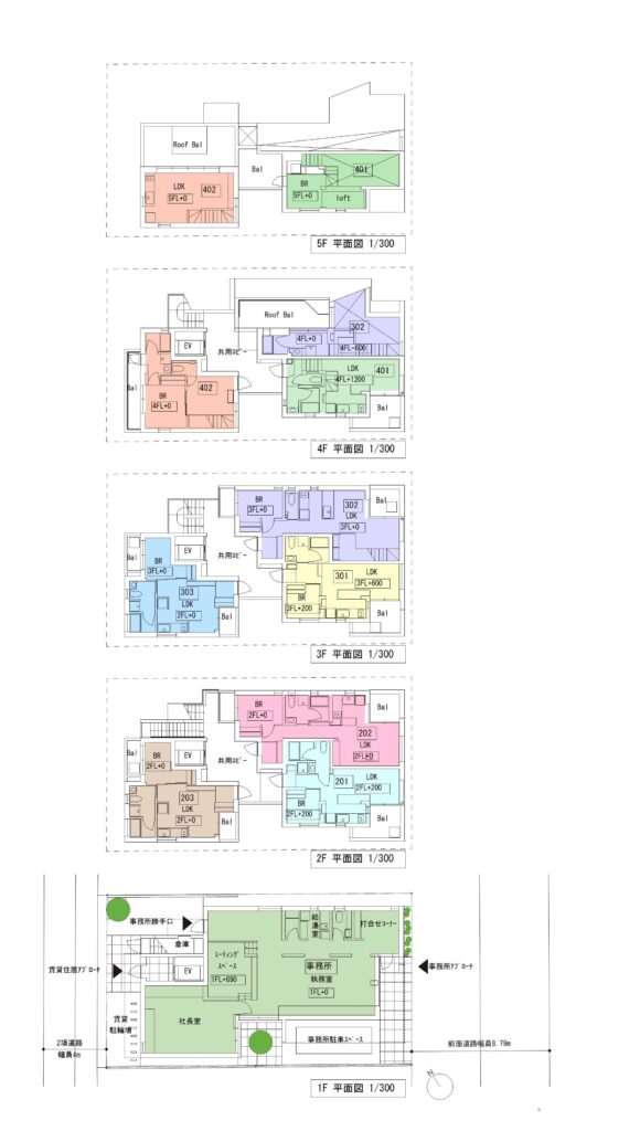 各階平面図 1階がオーナーオフィス。2階から5階に9戸の賃貸住宅。対角線に抜ける窓が特徴。