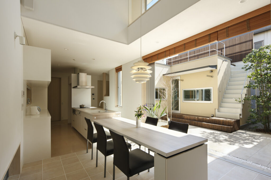 下落合の家。中庭に面して大きく開く窓と吹き抜けのある住宅。1階の床には蓄熱式床暖房を全面敷設。