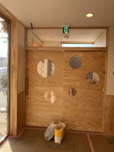 格子戸の右にはおむつ入れのパススルーがあります。格子戸と干渉しないところが苦労したところですが、無事に完成。