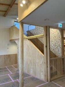 いろいろな窓、視線の抜ける方向の多方向性やぐるぐるまわるプラン。子供がワクワク体験を積み重ねてくれますように。建物が完了したら既存園舎を壊して外構工事に入ります。子供たちと共存しながら解体工事と外構工事。6月くらいには工事完了予定です。